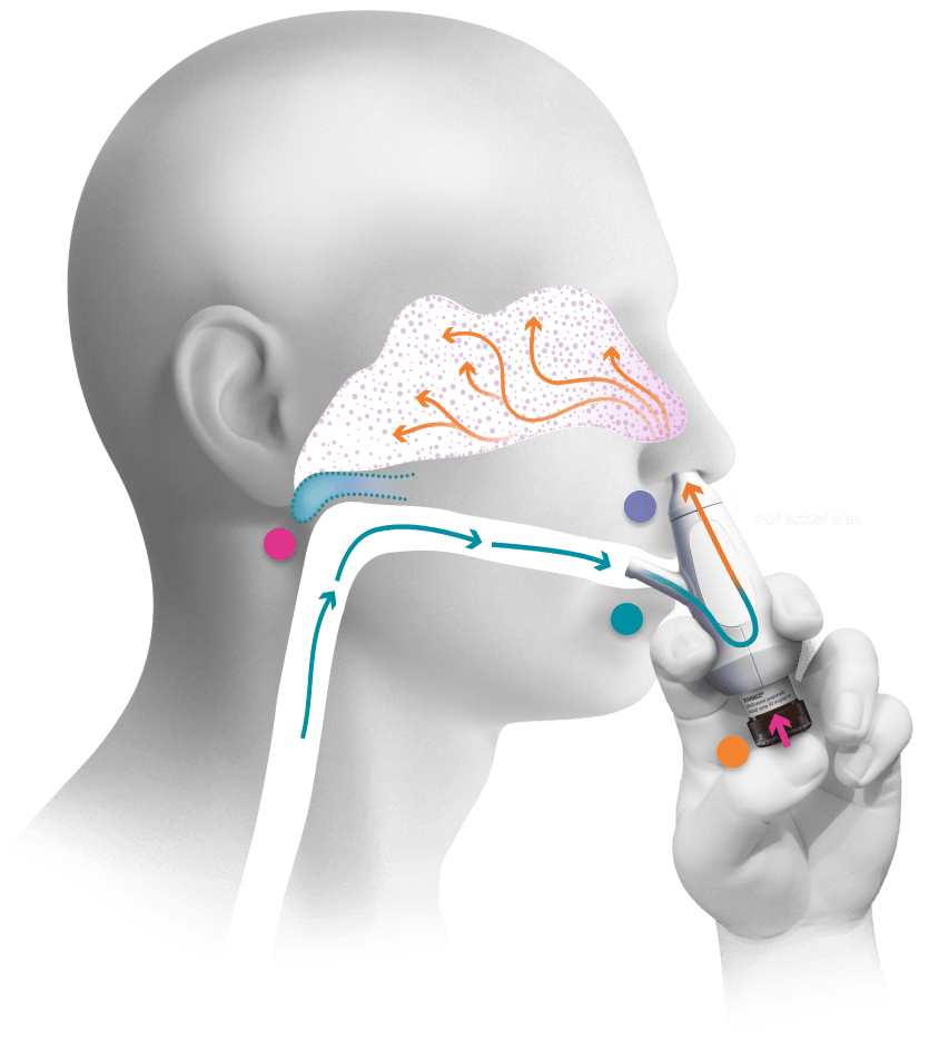 Keep blowing hard as you press the bottle with your thumb, releasing the medicine deep into your nasal passages.